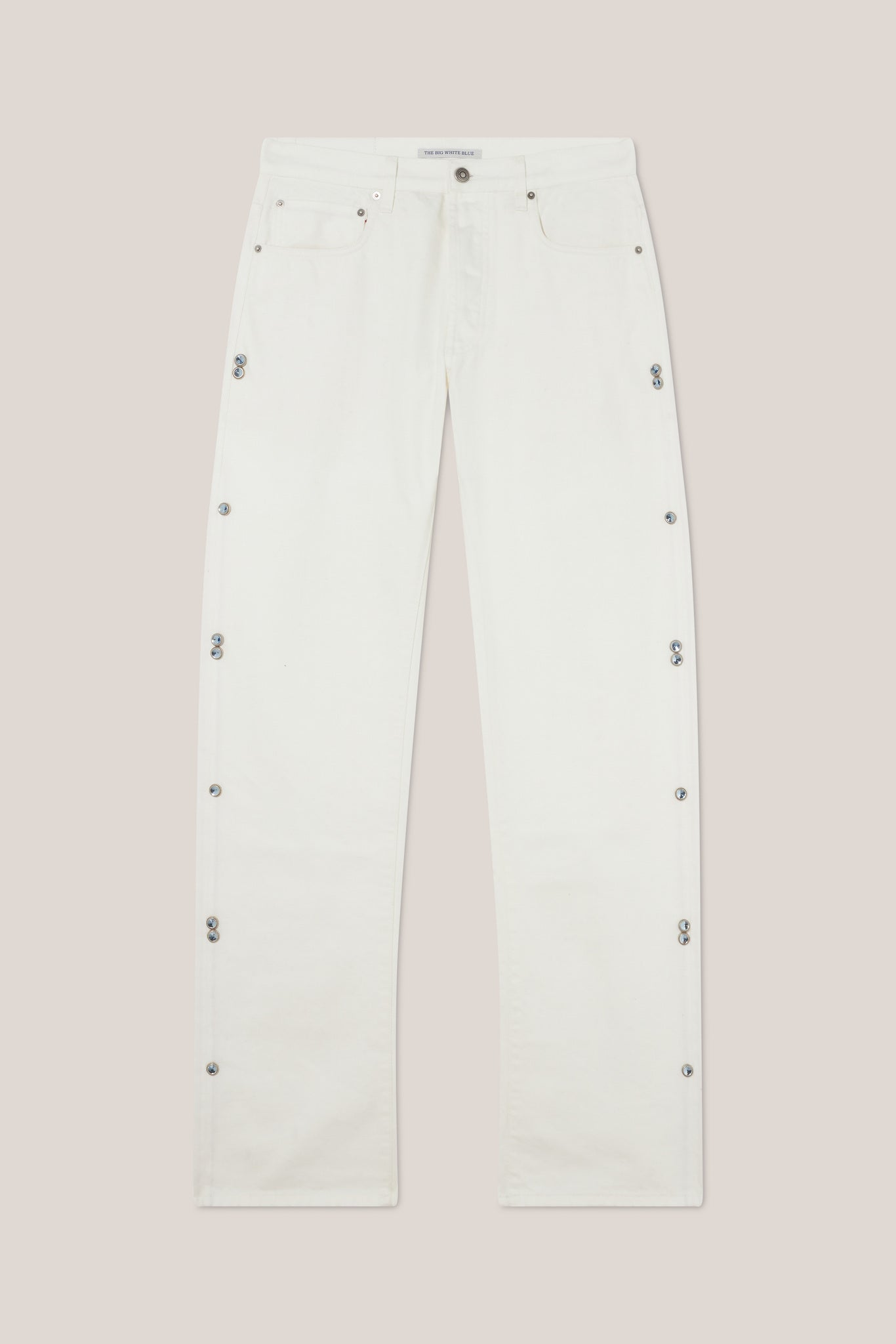 The Big White Blue trousers in white are made of Japanese denim. They feature relaxed fit straight leg, adorned with studs on side the leg and under the pocket.